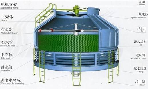 冷卻塔主要靠機械通風冷卻循環熱水。用泵將循環熱水送到水分布器噴出水沿著填料下淋落到水池。由風機將冷空氣引入與下淋的熱水接觸進行熱交換將水冷卻。